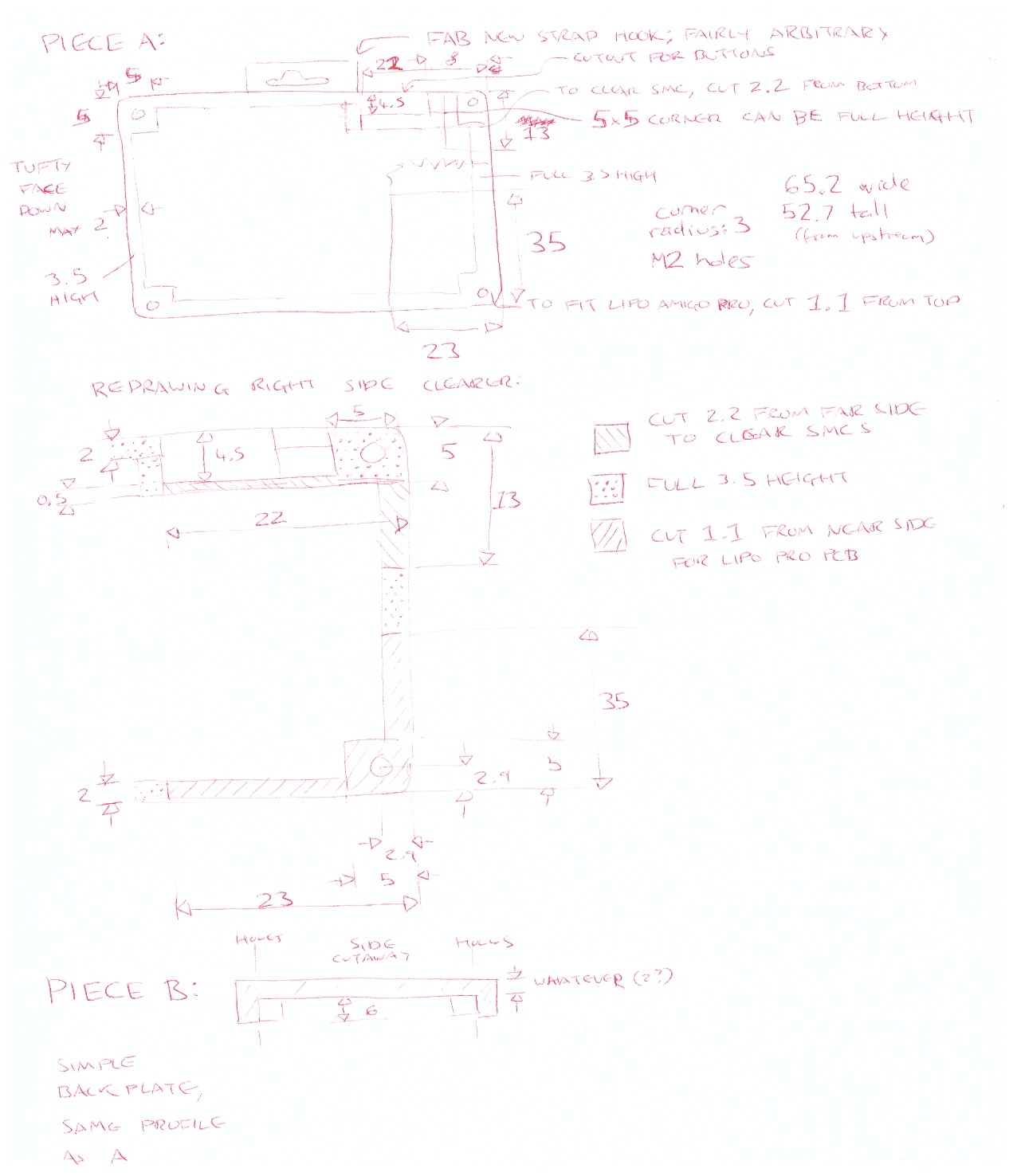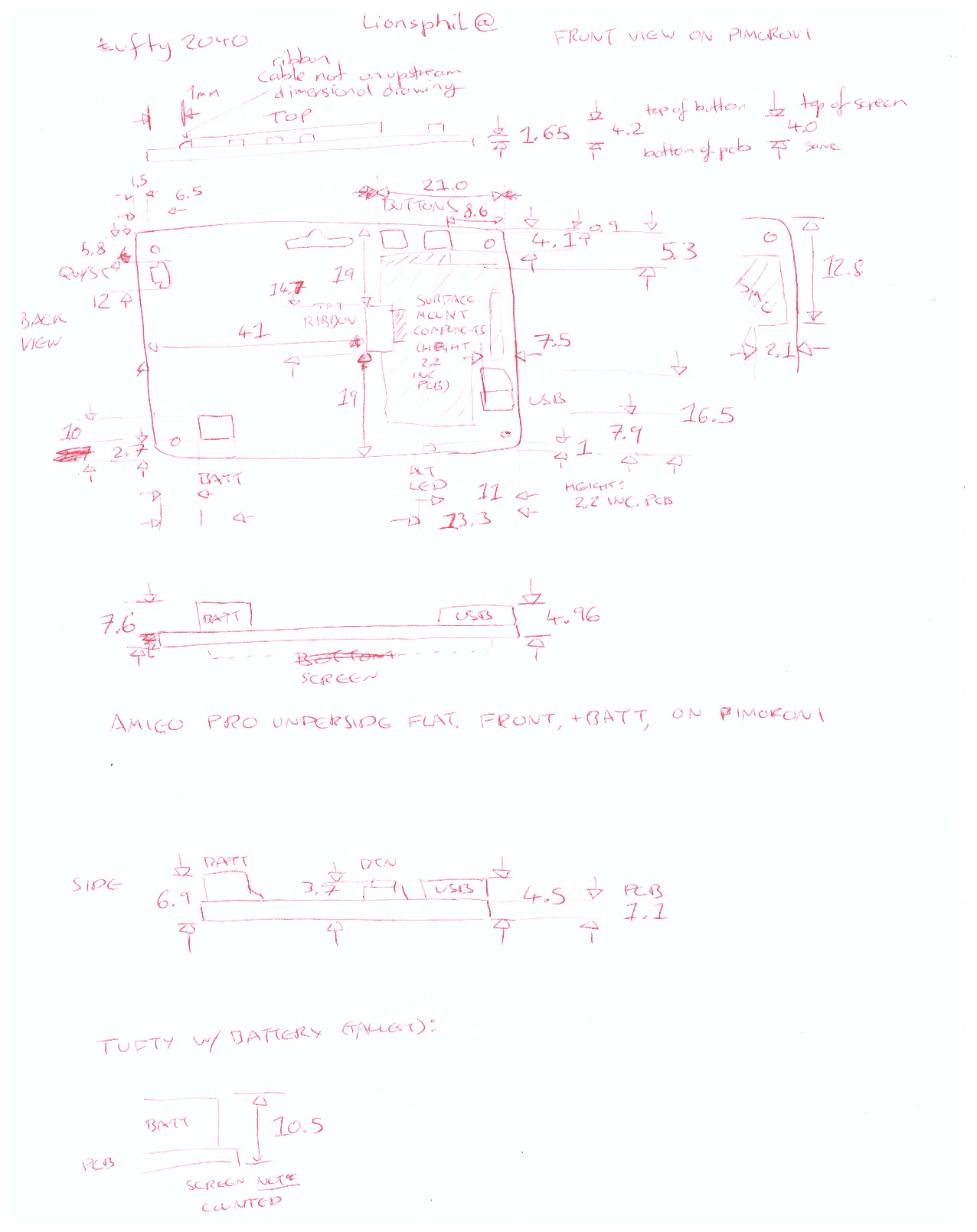 You can export from OnShape the sketches which are used to construct the modelled Tufty and Amigo PCBs (and battery), and the case, but these are not the complete model and are missing all the information on how they combine and are extruded/cut from each-other, so aren't great either. - Manual drawings: measurements, concept, design